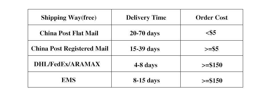 We ship all of our items worldwide within 48 hours by EMS/DHL or China Post Air Mail/China Post, theshipping way will depend on the total cost